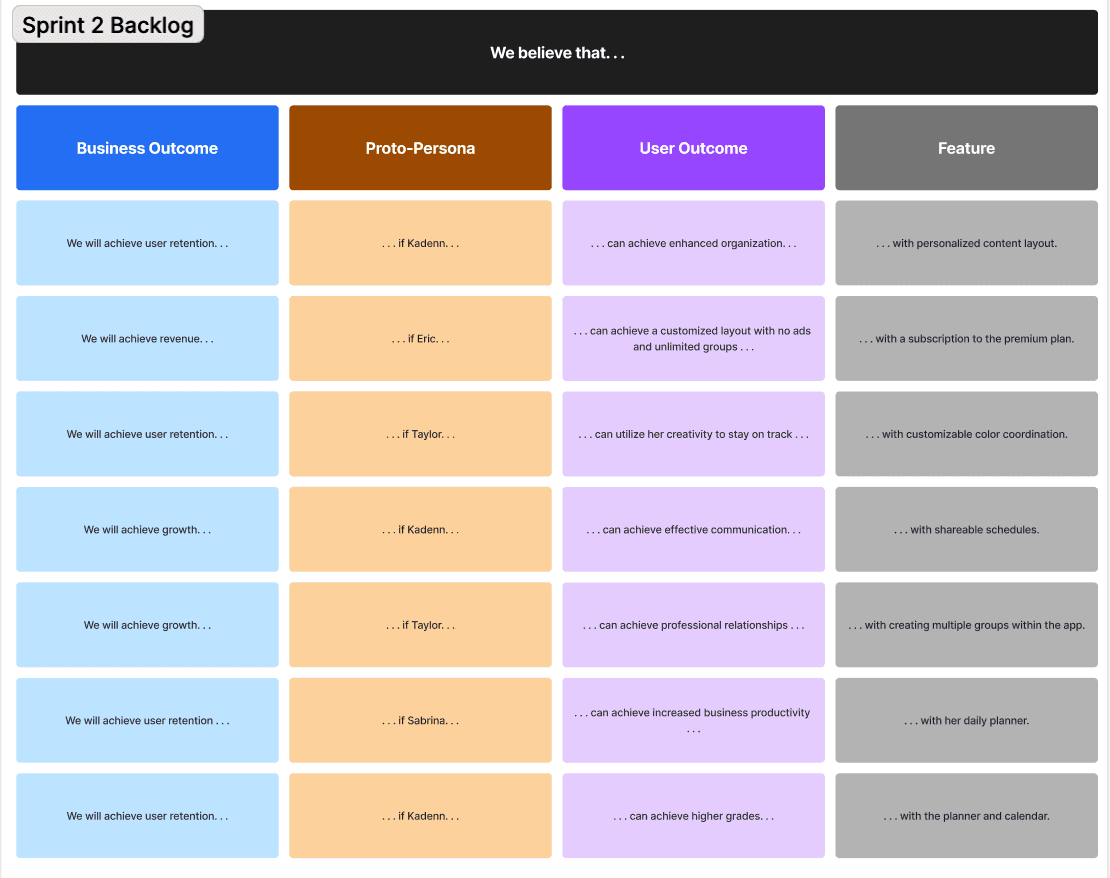 With clearer personas and validated assumptions, we refined our hypothesis table to link features, user outcomes, and business impact: