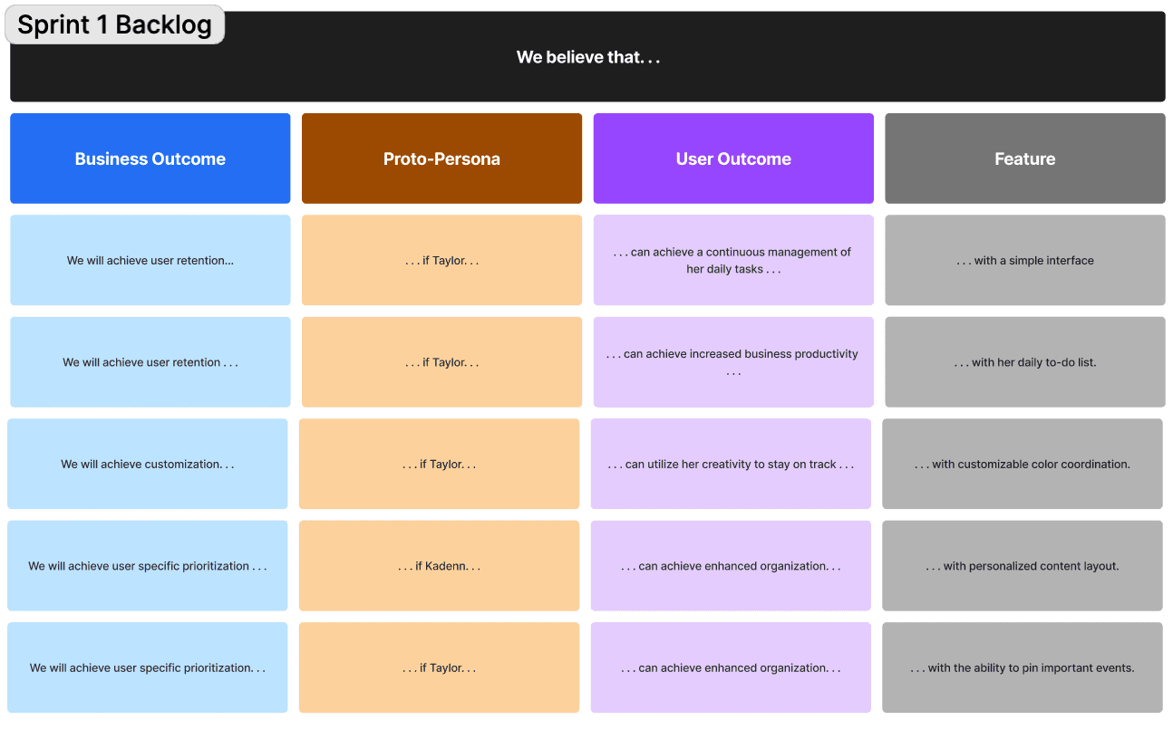 Refine user outcomes: We mapped how desired user outcomes—like easier task management and reduced stress—connected to business impact.