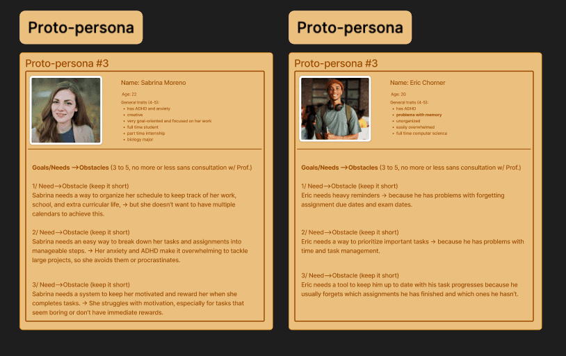 With Sprint 1 wrapped up, we took a step back to revisit our assumptions and make sure they still made sense based on what we learned from users. We added two new proto-personas to capture a wider range of ADHD experiences and used fresh insights to shape our designs.