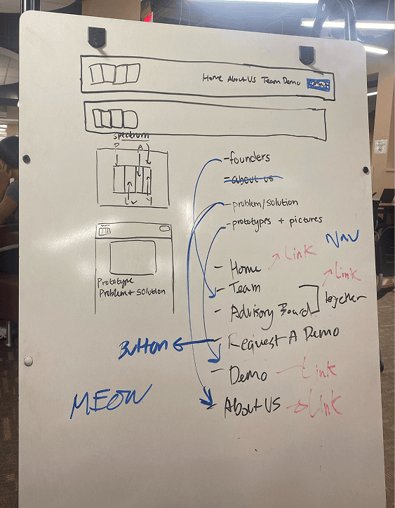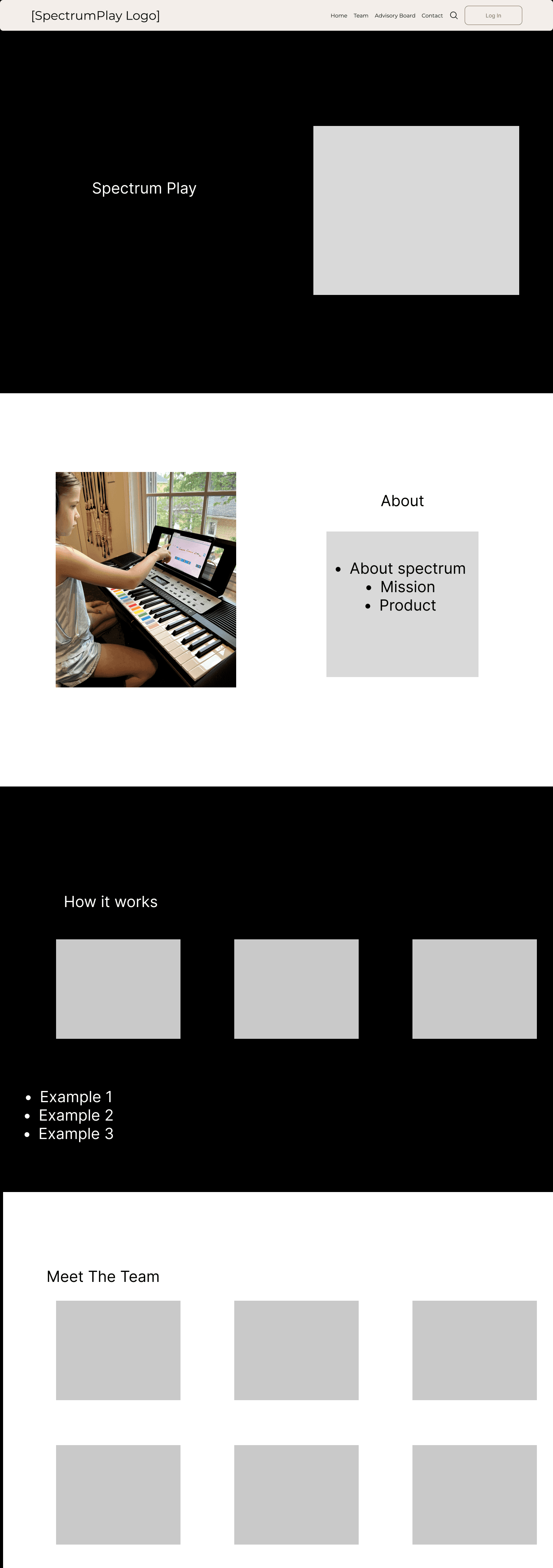 After sketching out our initial concepts, we translated those ideas into low-fidelity wireframes. This phase helped us focus on layout, content structure, and user flow without getting distracted by visual design. Our goal was to create a clear, scannable experience that guided users through SpectrumPlay’s mission, product, and team.