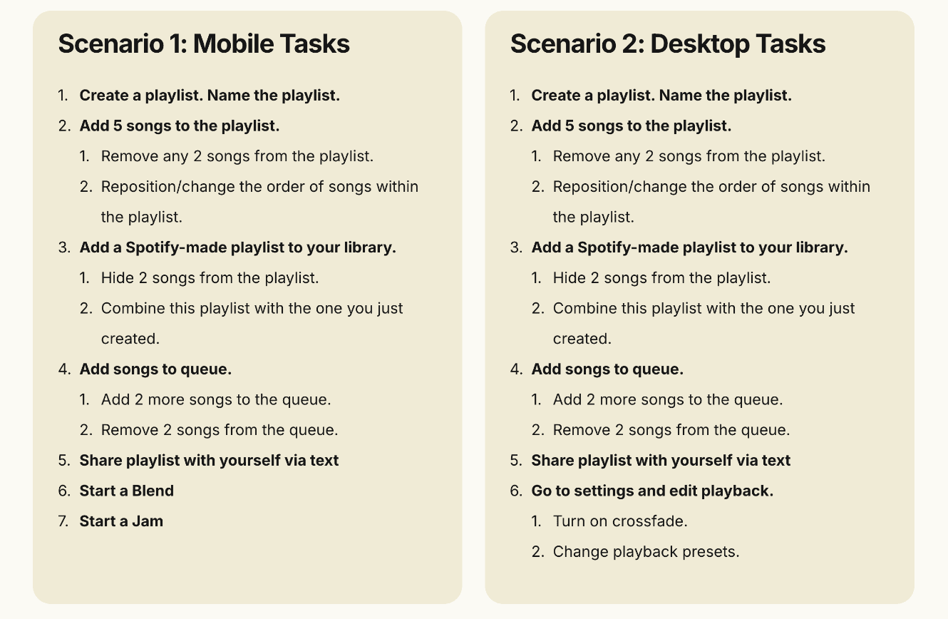 Participants were asked to complete 6 to 7 tasks on both mobile and desktop versions of Spotify. Here’s what we found: